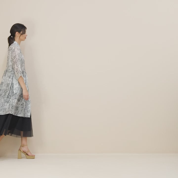 The barefoot in the park molly coat is crafted from 100% silk georgette, printed with Megan’s original barefoot in the park design, this incredibly light weight piece features delicate grey and white neutral tones.
