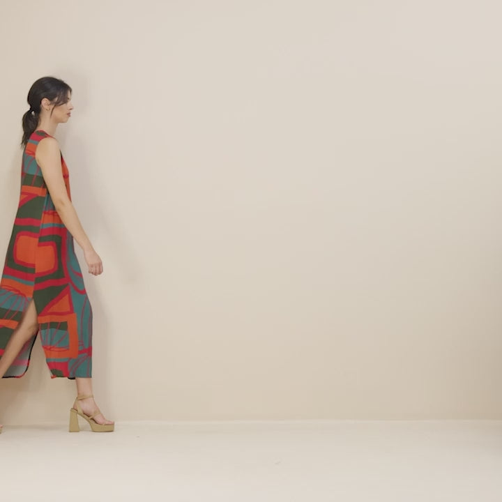 The origin crepe column dress features a striking original Megan Salmon print in vibrant orange, red, teal, and dark green. It boasts a straight column silhouette with 40cm side splits which allows flow and movement. A clean and elegant shape crafted from light and floaty crepe fabric.