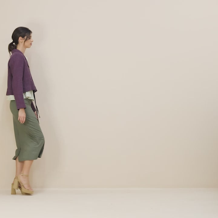 The birdie jacket can be worn open or fastened with hand-dyed coconut shell buttons. A subtle pleat at the mid-back adds a touch of flair, enhancing its slight A-line silhouette with a gentle kick. Finished beautifully with french seams.