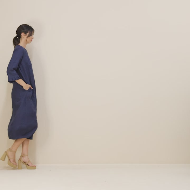 Our romance dresses are best sellers. Featuring a boat neckline edged with pleat detail, three quarter length sleeves with a gorgeous pleat cuff, stitched down side pockets, and a high waist that minimizes your upper body. The skirt of the dress is a full a-line shape brought in to a bell shape by strategically placed darts at the hem. This gives the dress lots of looseness in the hip without feeling like a sack.