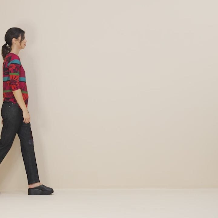The chrysanthemum audrey tee features an original Megan Salmon print. With a boat neck line and a beautifully finished faced neckband, three-quarter sleeves, and a straight silhouette with side splits. The audrey tee sits at a flattering length just covering the top part of the hip. Neat and versatile, ideal for layering under jackets or wearing over skirts and trousers. Made from viscose lycra, ensuring a soft and breathable feel on the body.