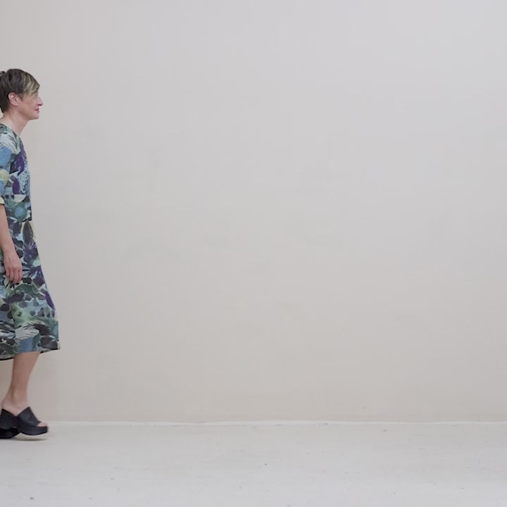 Our romance dresses are best sellers. This piece showcases park life, a striking original Megan Salmon print in greens, blues, and splashes of black with some hints of faint yellow peaking through. It has a gorgeous boat neckline that is very elegant, three quarter length sleeves and a high waist that minimizes your upper body. The skirt of the dress is a full a-line shape brought in to a bell shape by strategically placed darts at the hem. This gives the dress plenty of looseness in the hip without feeling like a sack.