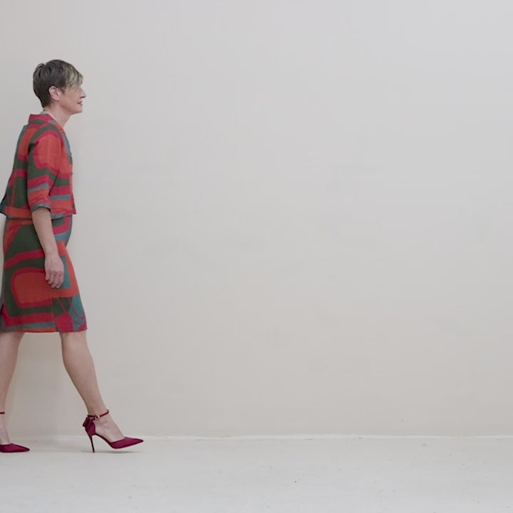 Add colour to any outfit with this striking original Megan Salmon print in orange, red, teal, and dark green. . Easy to wear with dresses as it is short and suitable as that last little layer.
