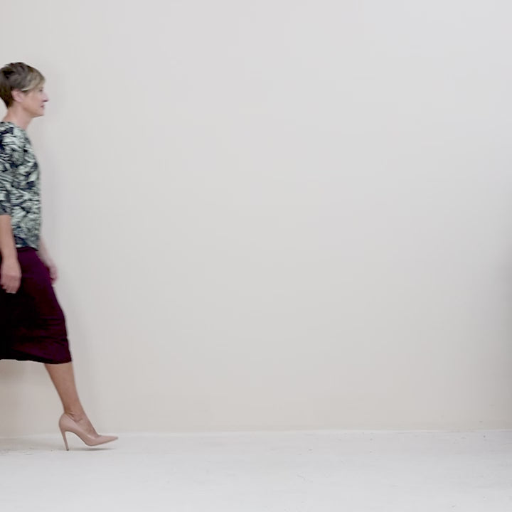 An original Megan Salmon print.  Featuring a boat neck line with a beautifully finished faced neckband, three-quarter sleeves, and a straight silhouette with side splits. The audrey tee sits at a flattering length just covering the top part of the hip. Neat and versatile, ideal for layering under jackets or wearing over skirts and trousers. Made from viscose lycra, ensuring a soft and breathable feel on the body.