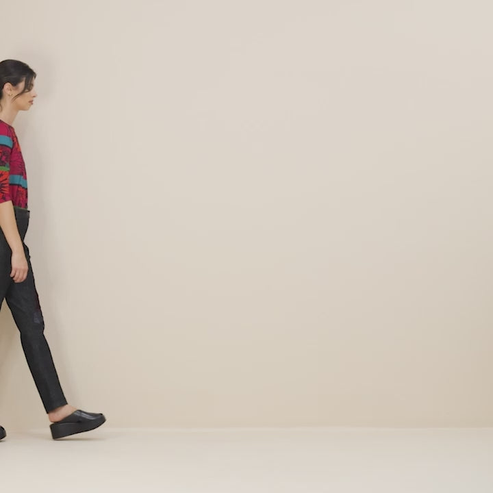The denim vespa jean showcases a beautiful vintage floral applique down just one leg, a dark plum colour, adding texture and difference without standing out.