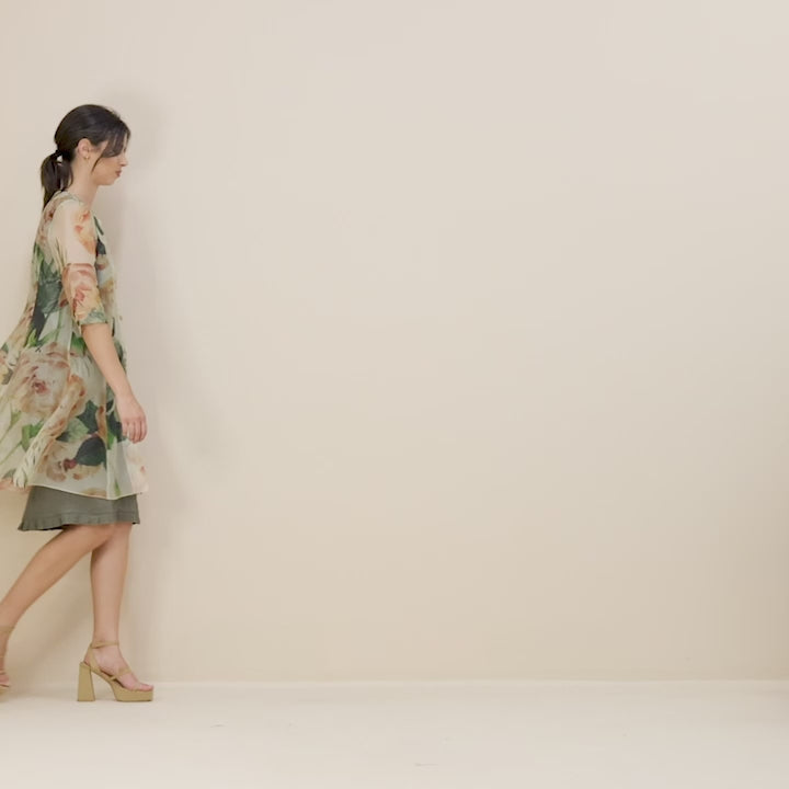 The roses organza dress coat features a stunning original Megan Salmon print. This dress-length coat embodies ultimate femininity, with gentle shaping that creates a flattering silhouette. With self covered buttons, three quarter sleeves, a round neckline, and stitched down pockets, it's beautifully finished with french seams.
