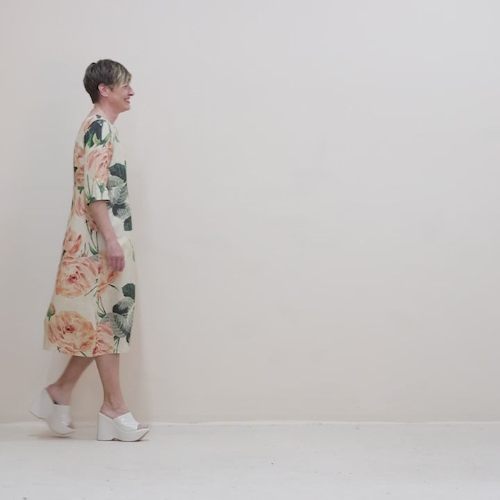 Our romance dresses are best sellers. This piece showcases roses, a romantic original Megan Salmon print in peach roses with the greens of the leaves and stems on a natural background. It has a gorgeous boat neckline that is very elegant, three quarter length sleeves and a high waist that minimizes your upper body. The skirt of the dress is a full a-line shape brought in to a bell shape by strategically placed darts at the hem. This gives the dress plenty of looseness in the hip without feeling like a sack.