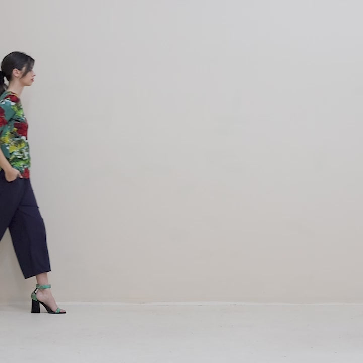 The rhapsody audrey tee features an original Megan Salmon print. With a boat neck line and a beautifully finished faced neckband, three-quarter sleeves, and a straight silhouette with side splits. The audrey tee sits at a flattering length just covering the top part of the hip. Neat and versatile, ideal for layering under jackets or wearing over skirts and trousers. Made from viscose lycra, ensuring a soft and breathable feel on the body.